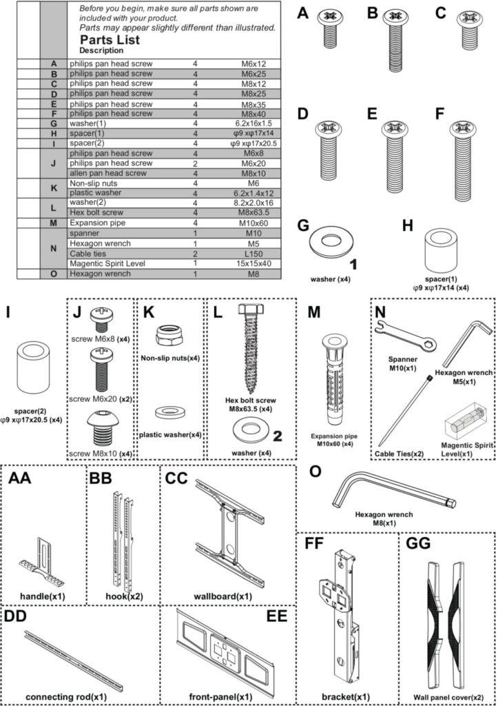 • In case the wall is concrete, use an expansion pipe. (In order to have a better installation, it is necessary to have in-wall wiring or wall AV and power plates installed to hide the cords behind the wall. We advise you get a professional installer to do this)