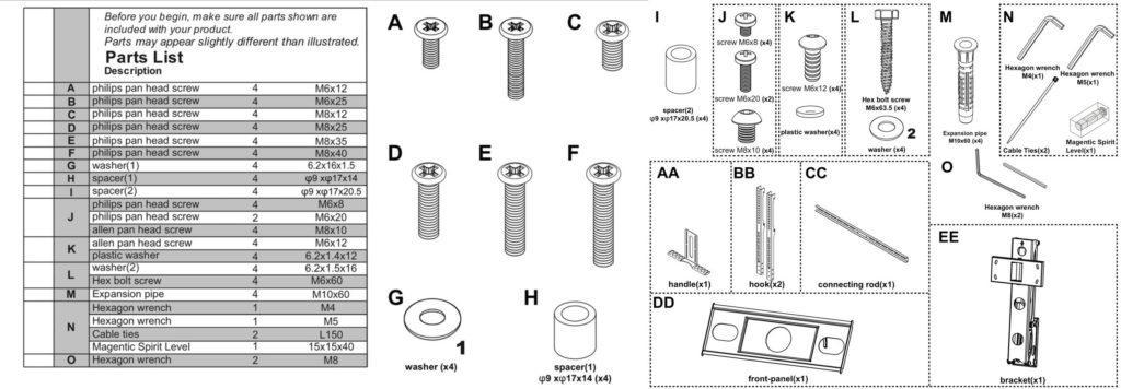 Take out K/EE/FF/N(spanner M10) from the packaging, installation as illustrated in the picture.